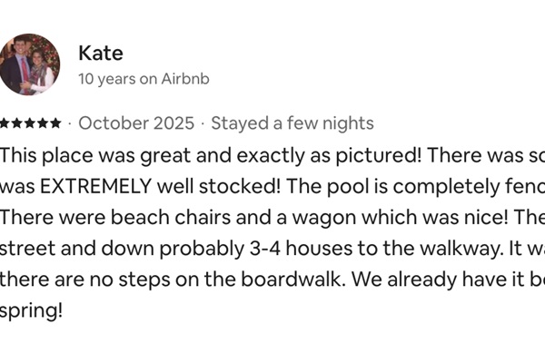 Beach chairs, umbrellas, boogie boards, and a beach cart that is easy to pull through the sand are all included.
